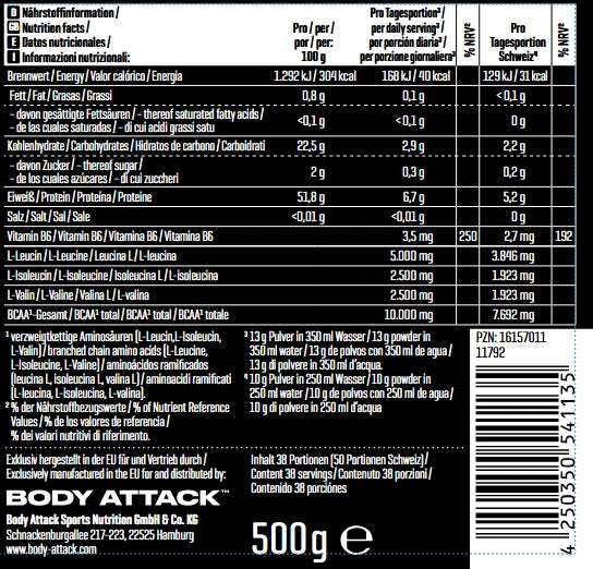 Kiirühendid BCAA* L-leutsiin 38,5%, L-isoleutsiin 19,2%, L-valiin 19,2%, emulgaator sojaletsitiin, happesuse regulaator sidrunhape, värvaine sulfiit-ammoniaakkaramell, lõhna- ja maitseained, maltodekstriin, magusained atsesulfaam K, sukraloos, püridoksiinvesinikkloriid 0,03%.