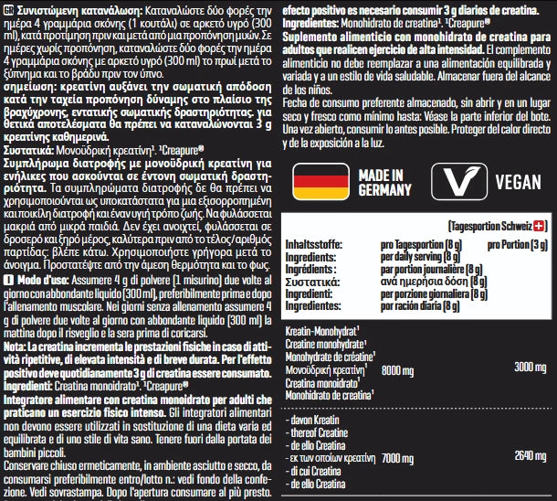 Kas soovid lihaseid ja/või jõudu kasvatada? See kreatiinilisand on just selleks loodud. Ülipeen kreatiinmonohüdraat patenteeritud CREAPURE® vormis imendub lihasrakkudes 100% ulatuses. Pulber lahustub vees kergesti, et aidata sul saavutada oma lihaste kasvatamise eesmärke. Loomulikult vegan ja GMO-vaba – kõige puhtam toimeaine kristallselgete tulemuste saavutamiseks. Võid sellele kindel olla!