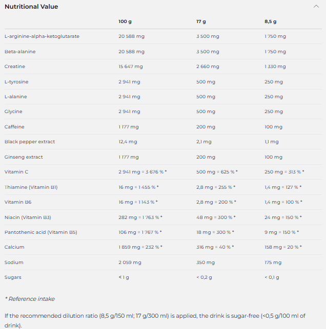 Toidulisand magusainetega. Sisaldab kofeiini (200 mg/17 g / 100 mg/8,5 g) – ei sobi lastele, rasedatele ega imetavatele naistele. Professionaalne toode maksimaalseks stimulatsiooniks enne treeningut! Pärast avamist hoida temperatuuril mitte üle 25 °C ja tarbida 3 kuu jooksul. Toimeainete kõrge kontsentratsiooni tõttu on segamisel näha lahustumata osakesi. See on toote loomulik omadus ja seda ei tohiks pidada defektiks. Ei asenda mitmekesist toitumist. Hoida lastele kättesaamatus kohas! Hoida kuivas kohas, temperatuuril mitte üle 25 °C, kaitstuna otsese päikesevalguse eest. Mitte külmutada. Tootja ei vastuta ebaõige kasutamise või säilitamise tagajärjel tekkinud kahjude eest.
